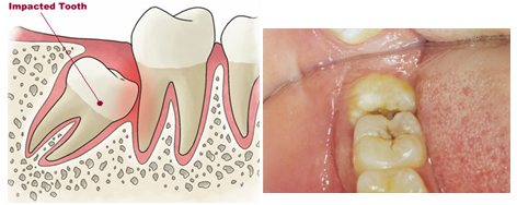 - Complete Bony Impaction: There is NO space for the tooth to erupt. It remains embedded in the jaw bone or if even partially visible requires complex surgical techniques for removal.The impacted wisdom tooth may also be in an unusual position and difficult to remove. This situation can also arise when the shape or size of the jaw bone and other facial structures make removal of this tooth significantly more complex.