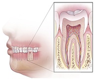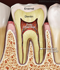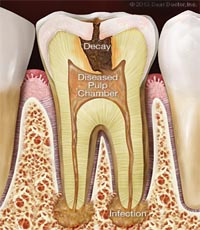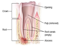 Each tooth has a soft tissue – the pulp which nourishes the tooth. Because of deep decay, injury, or gum disease, the pulp tissue in your tooth has become inflamed or infected. In any other part of your body, if a similar tissue becomes diseased, the body merely throws it off and forms new tissue. However, a tooth is a unique and different. Because the infected soft tissue (pulp) within the tooth is totally encased within hard tissue, it is the role of the dentist to remove the soft tissue located in the root canals, cleanse the area, and finally fill the canals with a special material so that bacteria cannot re-enter the tooth to cause another infection. When the endodontic treatment is complete, the tooth is by no means "dead". It receives quite adequate support from the surrounding tissues and may be expected to last as long as any other natural tooth.